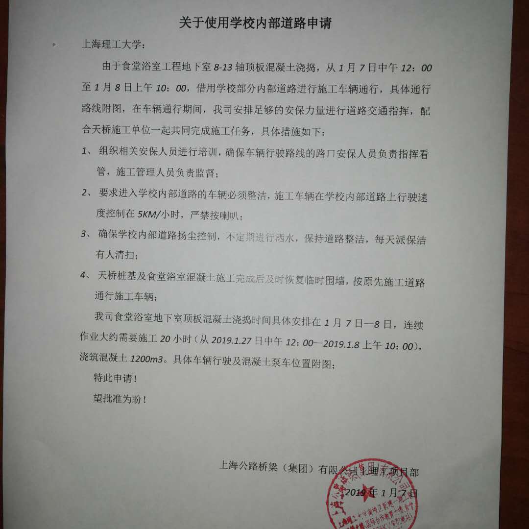 由于南校区新建一期工程食堂浴室工程地下室8-13轴顶板混凝土浇捣,从1月7日至1月8日止,借用学校部分内部道路进行施工车辆通行,具体通行路线附图。在此期间,大型工程车辆进出会对大家的生活和出行带来不便,在此,我们表示歉意。