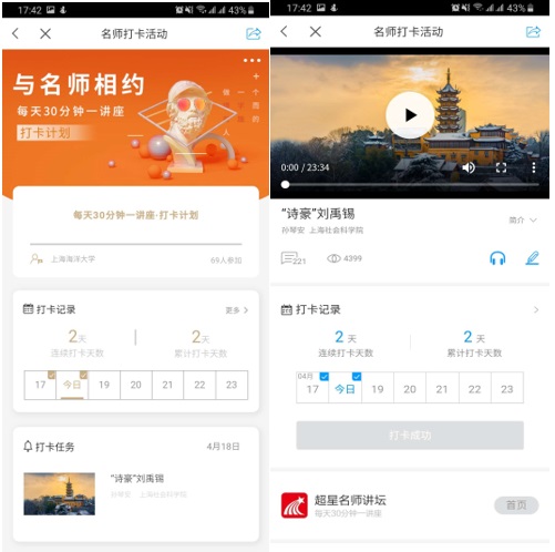 为了让全校师生深度体验数字图书馆里与名师面对面的魅力,也为了在一定程度上丰富读者们的知识储备,最后能养成一个每日学习的习惯。图书馆将携手超星集团在学习通APP上开展一场“与名师相约·每天30分钟—21天视频打卡”活动。