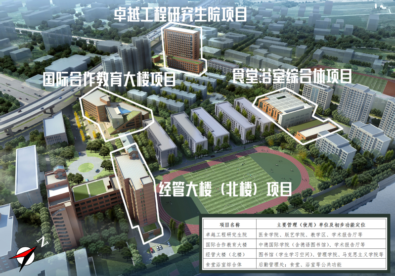 南校区新建一期工程4个单体建筑:卓越工程研究生院大楼项目、国际合作教育大楼项目、经管大楼(北楼)项目和食堂浴室综合体项目(见附件1图示)。