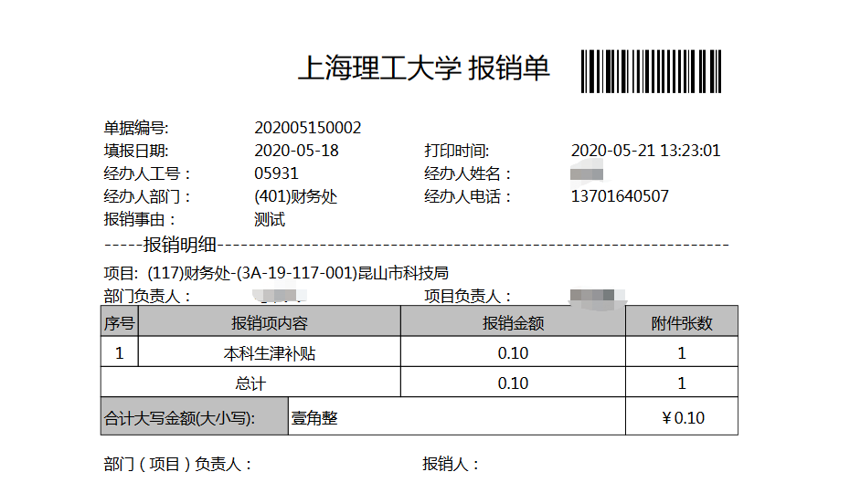 (6)打印成功后,项目负责人和经办人签字或盖章。随报销单、支票一同提交财务处13/14号窗口。