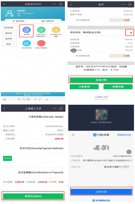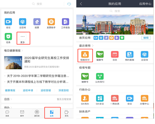 打开Welink,在业务模块“我的应用”中找到“校园支付”,进入支付界面,根据以下流程完成付款。