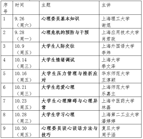 为了提升大学生的心理健康水平;促进大学生更好地发挥自助、互助、助人的积极性和主动性;增强心理委员的角色意识,提升心理委员的工作素养和能力;培养大学生积极向上、理性平和的心态。校心理健康教育中心邀请沪上高校的心理专职教师们做9期尚理之心讲堂,课程安排如下: