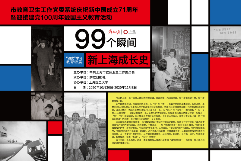 结合正在开展的“四史”教育,在新中国成立71周年和中国共产党建党100周年之际,金沙集团1862cc联合中共上海市教育卫生工作委员会、解放日报举办“四史”学习教育特展《99个瞬间——新上海成长史》主题展览。