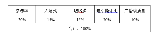 评定条件:根据体育竞赛参加的人数比例、入场式的质量、观众队伍的组织情况(人数、精神状态)、啦啦操比赛情况、道引操表演质量、各学院广播稿的投稿质量等方面进行评定。(宣传部负责统计汇总)。