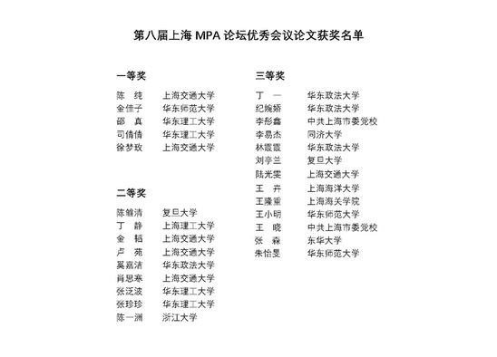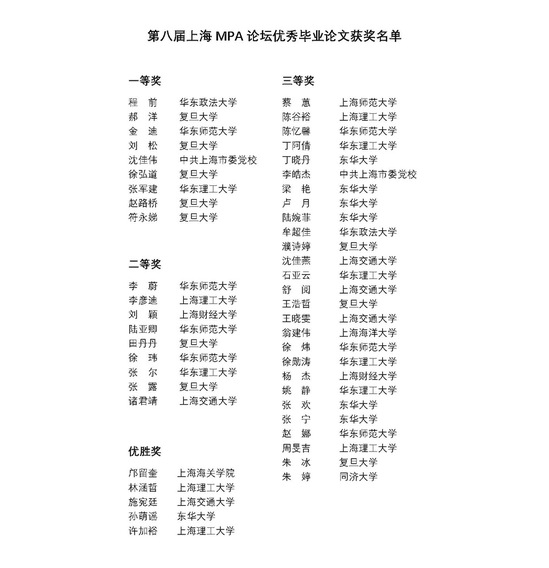 本届论坛共评选出优秀毕业论文一等奖9篇、二等奖9篇、三等奖27篇、优胜奖5篇,优秀会议论文一等奖5篇、二等奖9篇、三等奖13篇。金沙官网MPA学子李彦迪、陈谷裕、周旻吉、林涵哲、许加裕分别获得论坛优秀毕业论文二、三等奖和优胜奖,丁静获得优秀会议论文二等奖。