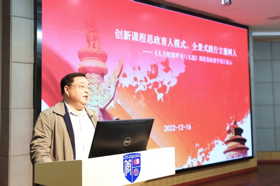 葛玉辉以“创新课程思政育人模式、全景式践行立德树人”为主题分享了“人力资源理论与实践”课程思政教学设计经验,重点讲解了课程思政教学理念、“四位一体”教学方案、全景式育人模式以及课程思政融入方法等,并进行了课程思政的经验交流与推广展示。