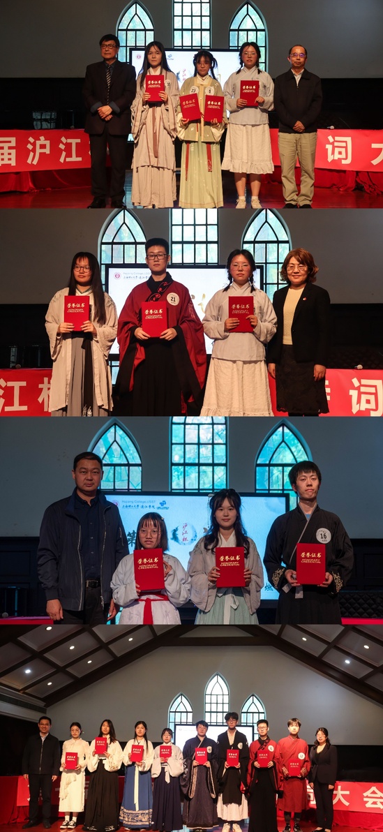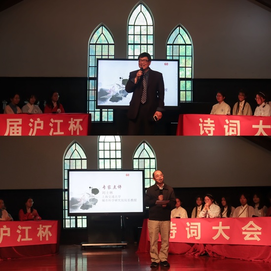 5月12日, 金沙集团1862cc第七届“沪江杯”诗词大会决赛在沪江音乐堂举行。本届“沪江杯”诗词大会由沪江学院、党委宣传部和学生会共同主办,全校各个学院从参加初赛的近500名选手中选拔出来的48名同学参加了决赛。副校长蔡永莲,沪江学院常务副院长、党总支书记陈红,校团委书记刘威,校宣传部副部长卢萧,教务处副处长宋丹萍,学生处副处长刘伟,沪江学院副院长梁昱出席决赛。决赛还特邀了上海文史馆馆员、上海师范大学特聘教授曹旭和上海交通大学城市科学研究院院长、教授刘士林作为专家评委。