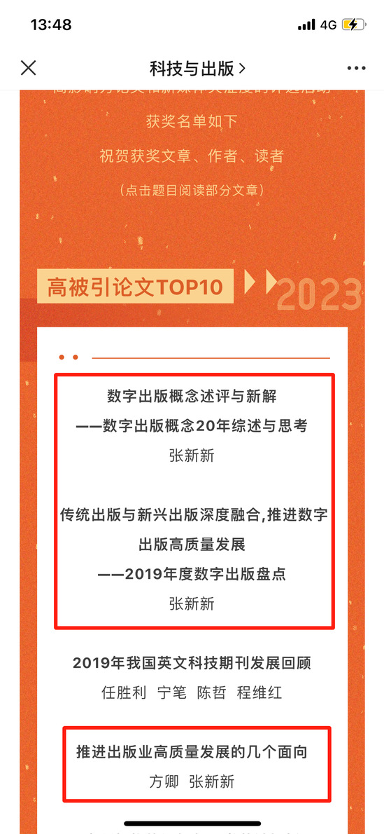 除此获奖论文外,张新新教授3篇论文还入选《科技与出版》2022年度高被引论文TOP10。3篇论文分别为:《数字出版概念述评与新解——数字出版概念20年综述与思考》(独作), 《传统出版与新兴出版深度融合,推进数字出版高质量发展——2019年度数字出版盘点》(独作),《推进出版业高质量发展的几个面向》(通讯作者,《新华文摘》(2020年第9期)全文转载)。