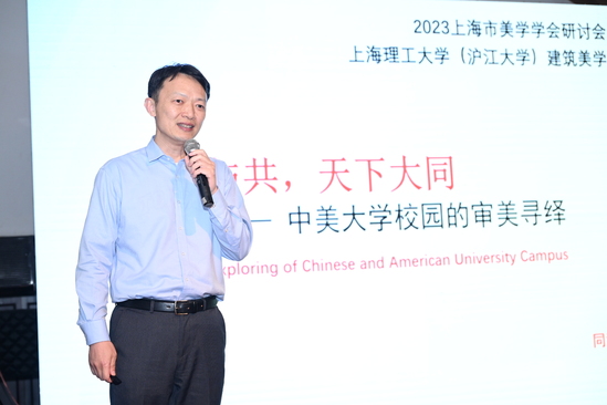 同济大学文化产业研究中心主任黄松教授做了题为“中美大学校园的审美寻绎”的发言。黄松教授首先对中美大学校园的演化历程做了对比性的历史回顾,并结合建筑美学的概念透析,从本体论、认识论、方法论、价值观、科技观、发展观六个维度予以解析。他从整体规划层面的空间形态、单体建筑层面的风格特征、景观小品层面的文化意蕴三个方面,对中美大学校园进行了特征归纳。基于建筑中信息含量的加速增加所带来的审美上的聚变反应,需要站在更高的纬度来重构建筑美学所研究的分层次、动态的价值系统。中美大学校园虽然存在差异,但在建筑美学层面存在着一个更底层的同构关系,找到这个关系,方能真正实现所谓“美美与共,天下大同”。