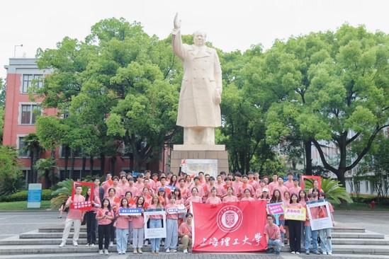 同学们从516号校门出发,在校园内按照五星轨迹进行表白跑,同时在各点位手持创意宣传品打卡拍照,将一块块印有青春宣言的宣传板放在胸前、举过头顶,亦是将青年学生对祖国的爱刻画在心、将青年学生的强国梦想放飞翱翔。同学们最后在毛主席像合影留念。