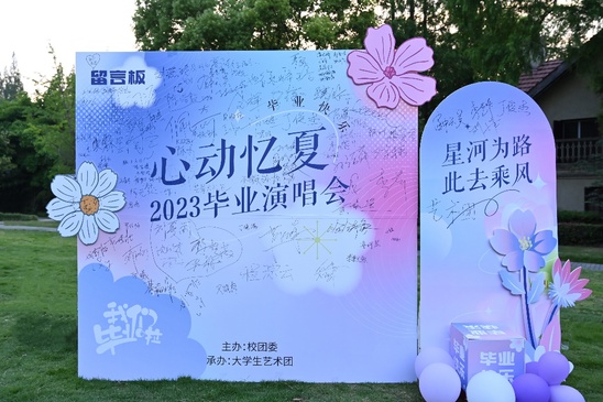 青春、音乐,离别、祝福。初夏的午后,阳光正好,同学们围坐在草坪上,享受着飘融在夏日微风里的旋律,整个过程欢声阵阵,温馨美好。活动结束后同学们纷纷在喷绘留言板上签名并合影留念。