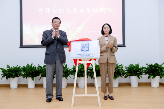 庆祝大会上举行了外语学院院徽启用仪式,蔡永莲、洪涌清为院徽揭幕。院徽以印章、书本、盾牌为主体图案,将中国传统篆书与英文字母相结合,传达了外语学院专业、严谨、中外融通、国际化的人才培养特色,彰显了民族文化自信和当代设计艺术风格。院徽以蓝色为主,橙色为辅,代表纯洁、博大、科技、进取,也象征创造力、积极、乐观与收获。